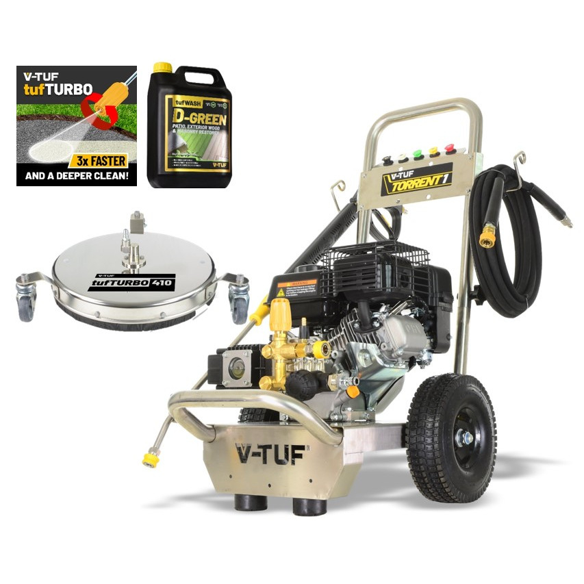 V-TUF TORRENT 1 Petrol Pressure Washer, comes with 10m hose, DURAKLIX MSQ and SSQ quick release coupling system, spray gun and lance, detergent injection, plus a selection of four variations of SSQ power clean jets, and with the robust long-life V-TUF pump, you have the ability to source water from an external tank.