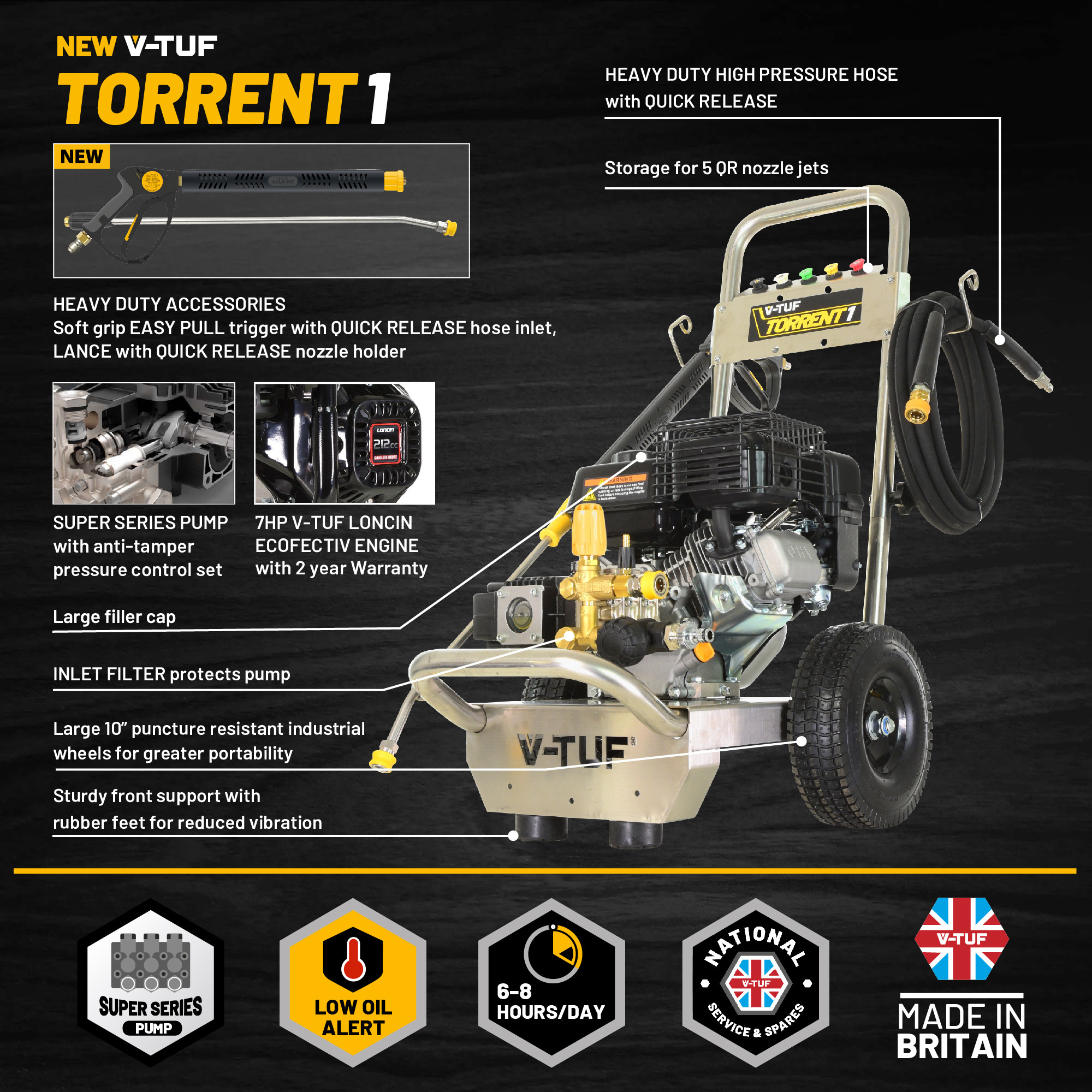 876.59 2026-03-21The V-TUF TORRENT1 cold water petrol pressure washer is best known for continuous operation in tough operating conditions. With the popular VT5 pump which provides 2755psi (190 bar) cleaning power, and a supply of 13L/Min, this trolley mounted mobile 7HP Petrol Power Washer is one of the most Compact, and reliable yard cleaners on the market.