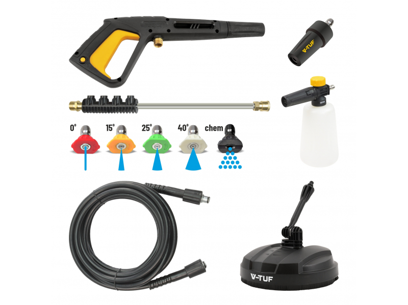 V-TUF V3 boasts a maximum pressure of 2175psi, 2000 watt motor, self-priming pump, integral chemical tank with injection and application function, Quick release Nozzle system including a Turbo nozzle, Patio Cleaner, Foamer cannon, Quick Release accessories – making it compact, powerful and portable – all you need is a good water supply.
