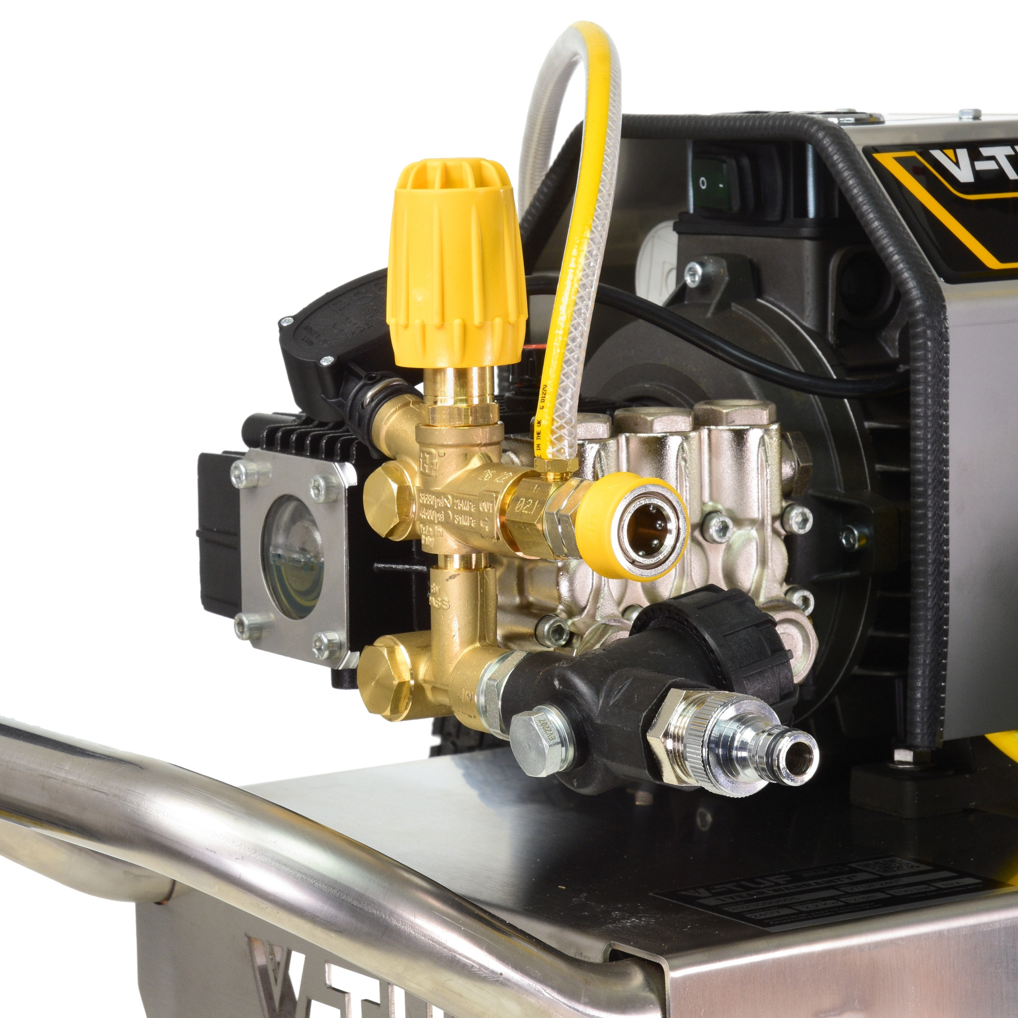 The V-TUF VTUF240THR is a stainless steel covered, tough well built, well proven, reliable 240Volt Electric Power Washer with the ideal balance of pressure (100 bar / 1500psi) and flow (12 litres per min) on 240volt electric supply, specifically designed for use on construction sites and for hire industry. Benefits: long reach 20m hose with Robust hose reel & Frame with Comfortable Handle. Heavy-Duty Pump & Unloader Valve. Inlet Filter. Chemical Injection. Black Powder Coated Frame. 10" Pneumatic U-Shaped Puncture Proof Wheels. VTUF240THR power washers are known for being powerful, versatile, robust, tough, well built, well proven, and a totally reliable 240 Volt Electric Pressure Washer, equipped with an oversized V-TUF triplex pump the machine can suck from a tank or an IBC where a mains water supply might not be in place. The high pressure blasting turbo nozzle provides even deeper clean for performing the most difficult cleaning tasks and can increase the cleaning speed by 3X that of a standard jet. The DuraKLiX System makes the hose, trigger, lance and nozzles easy to connect and disconnect without the need for tools. The compact design with the wide chunky rugged 10 wheels and collapsible handle with comfort grip makes it highly manoeuvrable across site and easy to transport in small vans. The low revving pump and motor unit ensures a long working life, combined with readily available seals and valves and simple rugged electrics which has no expensive circuit boards to replace. Therefore lower servicing costs making it the ideal choice for use in hire fleets and on construction sites. The ideal 240v electric pressure washer for the any one in the construction industry, who is looking for best value on their investment for property and vehicle cleaning maintenance. Can be used almost anywhere to clean vehicles, plant, machinery, brickwork, gutters, roofs, pathways, driveways, concrete pads... and much more. Industries: