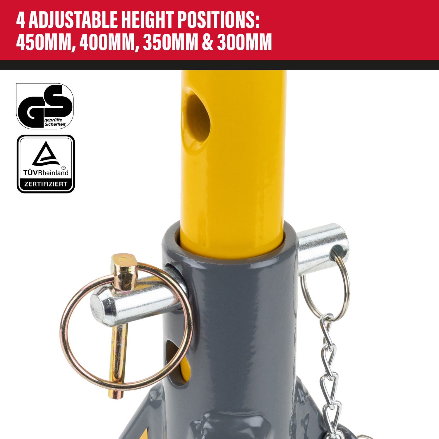 HEAVY-DUTY JACK STANDS FEATURING A SOLID BAR PIN DESIGN & 6 HEIGHT ADJUSTABLE POSITIONS TO ENSURE SAFETY & STABILITY UNDER LOAD